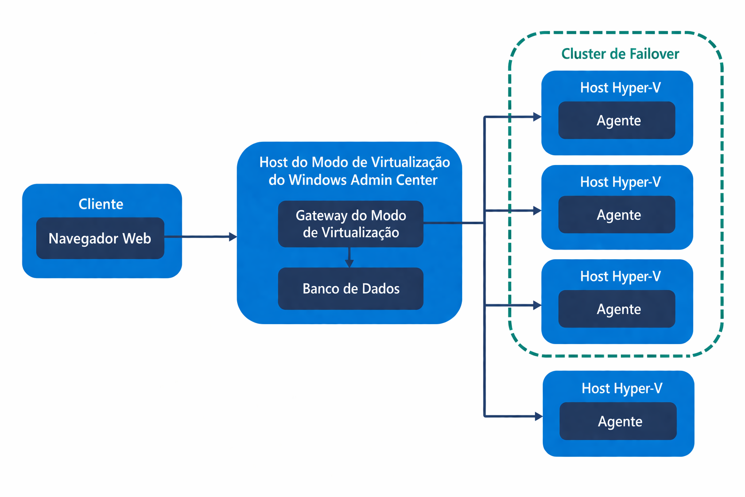 Esse modo usa uma arquitetura cliente-servidor com um gateway baseado na Web e agentes locais em hosts Hyper-V gerenciados. O gateway manipula a autenticação do usuário, o roteamento de solicitações e mantém um banco de dados com estado, enquanto os agentes executam operações em hosts. O TLS protege a comunicação entre o gateway e os agentes.