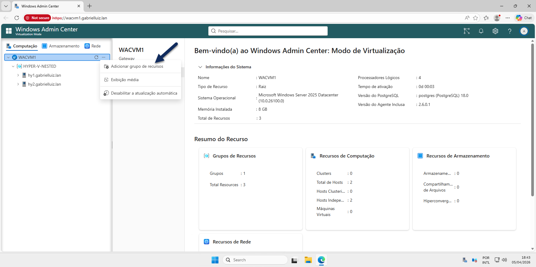 No vídeo será demonstrado, de forma clara e objetiva, o que é o Windows Admin Center Virtualization Mode (em português, Modo de Virtualização do Windows Admin Center), bem como seus requisitos. Também vamos aprender a configurar, criar um grupo de recursos e adicionar servidores com a função de Hyper-V, demonstrando todo o processo de inclusão no Modo de Virtualização do Windows Admin Center.