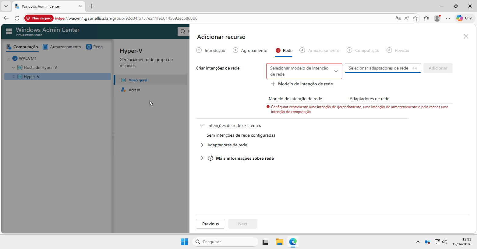 Opções de Modelos de intenção de rede Modo de Virtualização do Windows Admin Center
